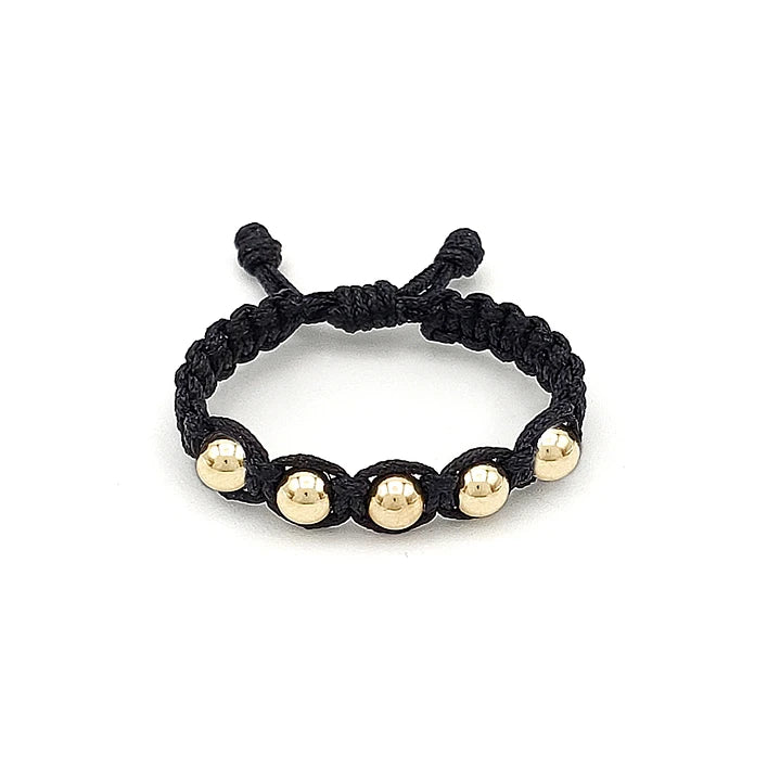 Te presentamos nuestro elegante anillo tejido con cordón italiano negro de 1mm, adornado con delicados balines de Oro Laminado de 18k de 4mm. Esta pieza única combina la elegancia con el lujo sutil del oro laminado, creando un diseño sofisticado y versátil que complementará cualquier atuendo con un toque de distinción.