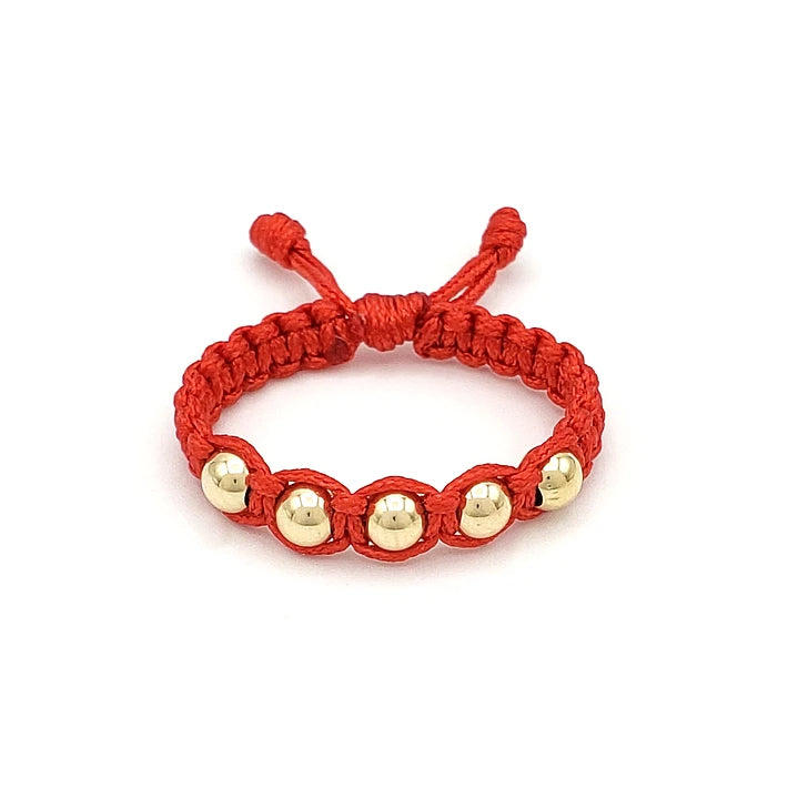 Te presentamos nuestro elegante anillo tejido con cordón italiano rojo de 1mm, adornado con delicados balines de Oro Laminado de 18k de 4mm. Esta pieza única combina la elegancia con el lujo sutil del oro laminado, creando un diseño sofisticado y versátil que complementará cualquier atuendo con un toque de distinción.