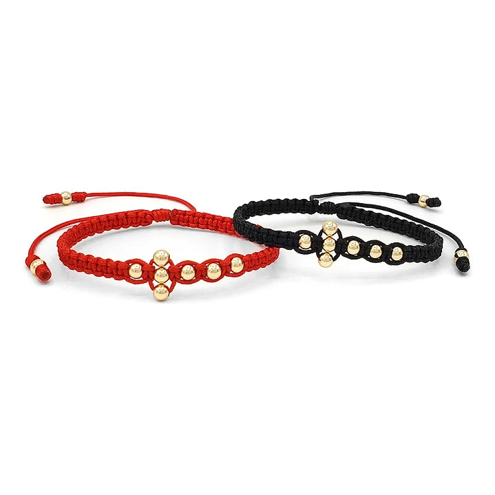 Pulseras elaboradas con Tejido Macramé de Cordón Italiano Rojo - Negro y Balines 4mm de Oro Laminado 18k. El precio es por el par (2 Pulseras). Van empacadas en Cajita para Obsequio.