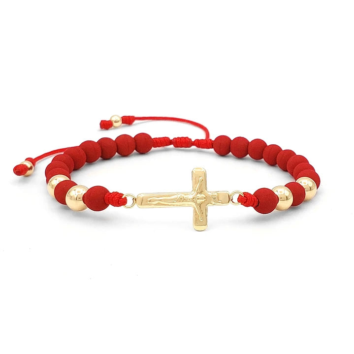 Pulsera elaborada con Cordón Italiano Hilo Rojo, Neopreno Rojo o Negro, Dije de Cruz Cristo de 10 milímetros de alto por 18 milímetros de largo y Balines Oro Laminado 18k de 6mm. Va empacada en Cajita para Obsequio.