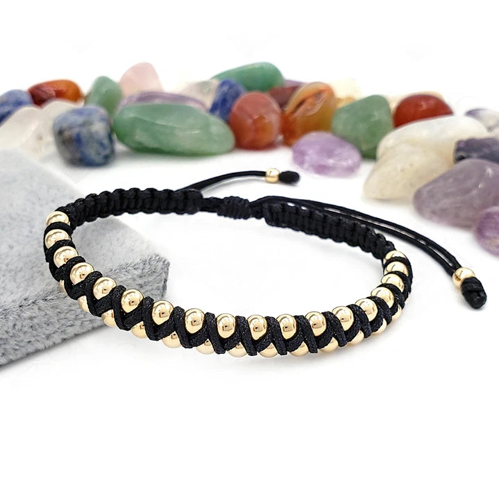 Pulsera elaborada con Cordón Italiano y Balines de Oro Laminado 18k de 4mm. Va empacada en Cajita para Obsequio.