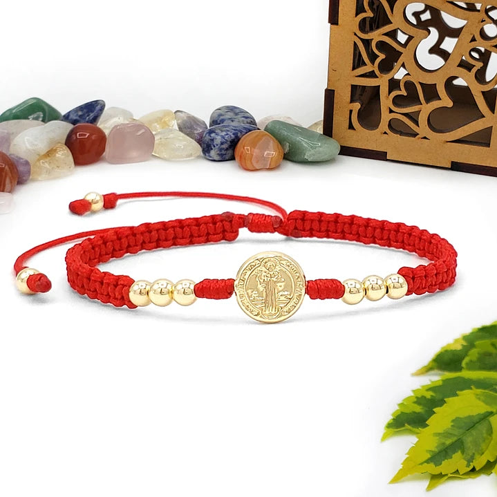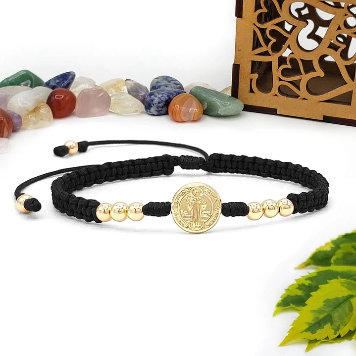 Descubre la devoción y la elegancia con nuestras pulseras artesanalmente elaboradas, que combinan la sagrada Medalla de San Benito de Abad de 10mm con delicados balines de Oro Laminado de 18k de 4mm y tejido macramé con cordón italiano. Estas piezas no solo son un accesorio de moda, sino también un potente símbolo de protección y fe, diseñadas para acompañarte con estilo y significado.