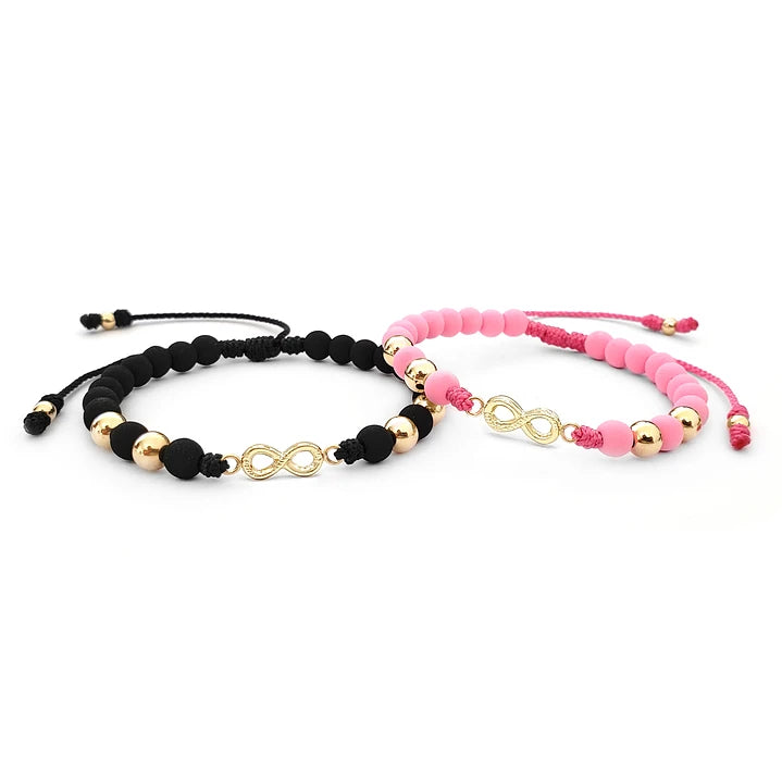 Par de Pulseras para Parejas elaboradas con Cordón Italiano, Infinitos de Oro Laminado, Neopreno y Balines de Oro Laminado de 6mm. El Precio es por las 2 Pulseras. Van empacadas en Cajita para Obsequio.
